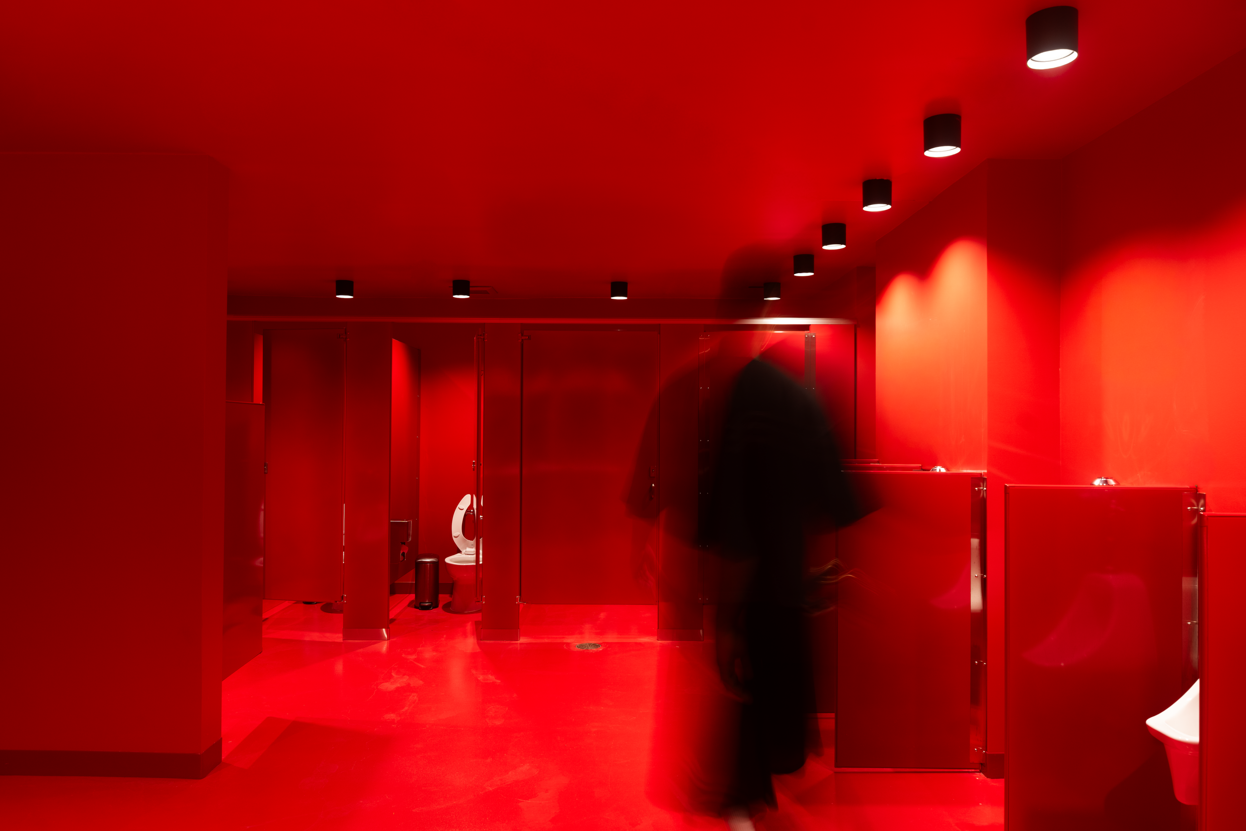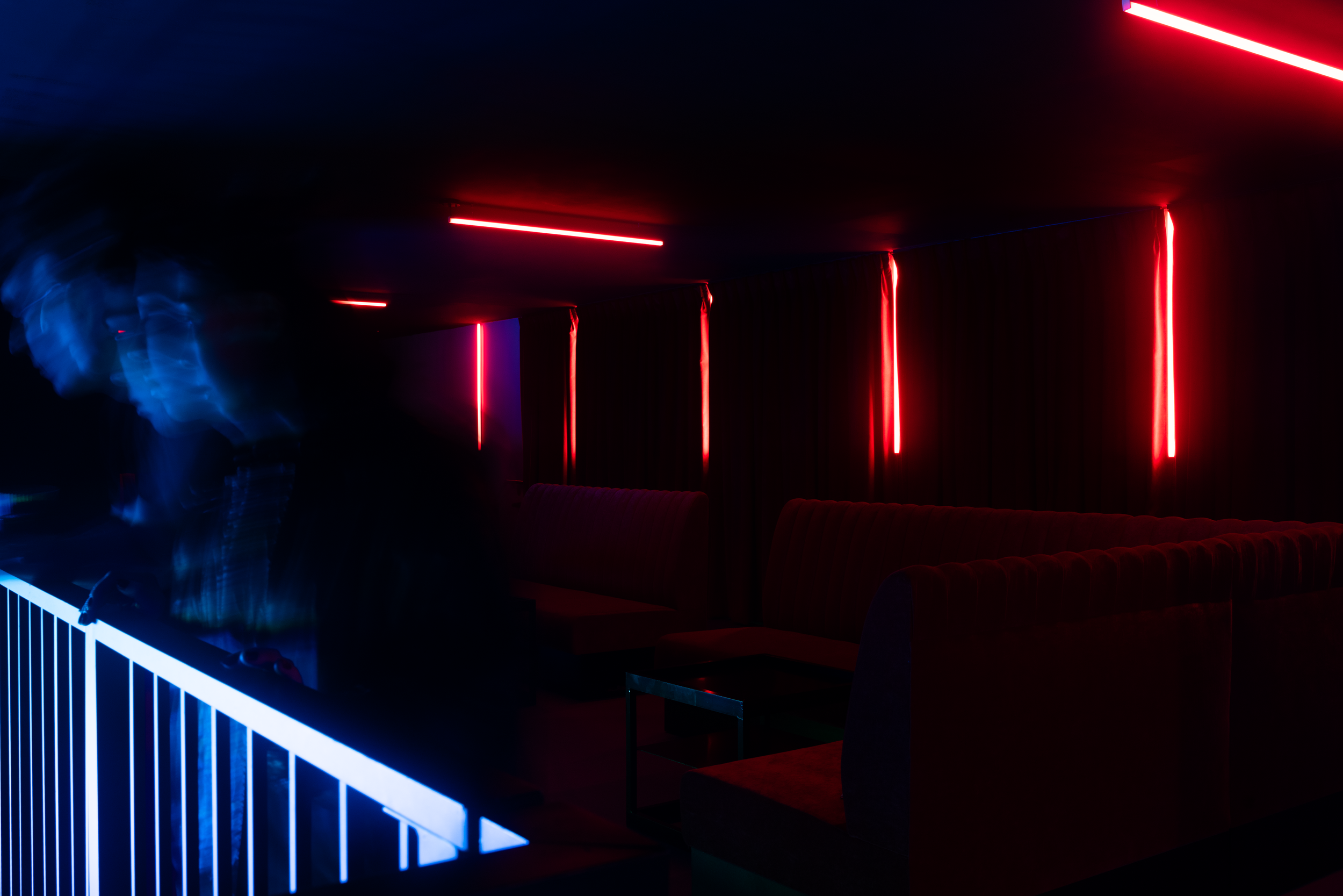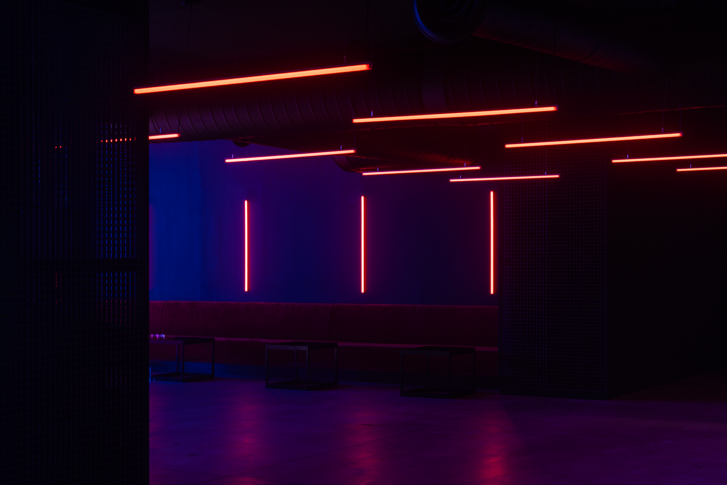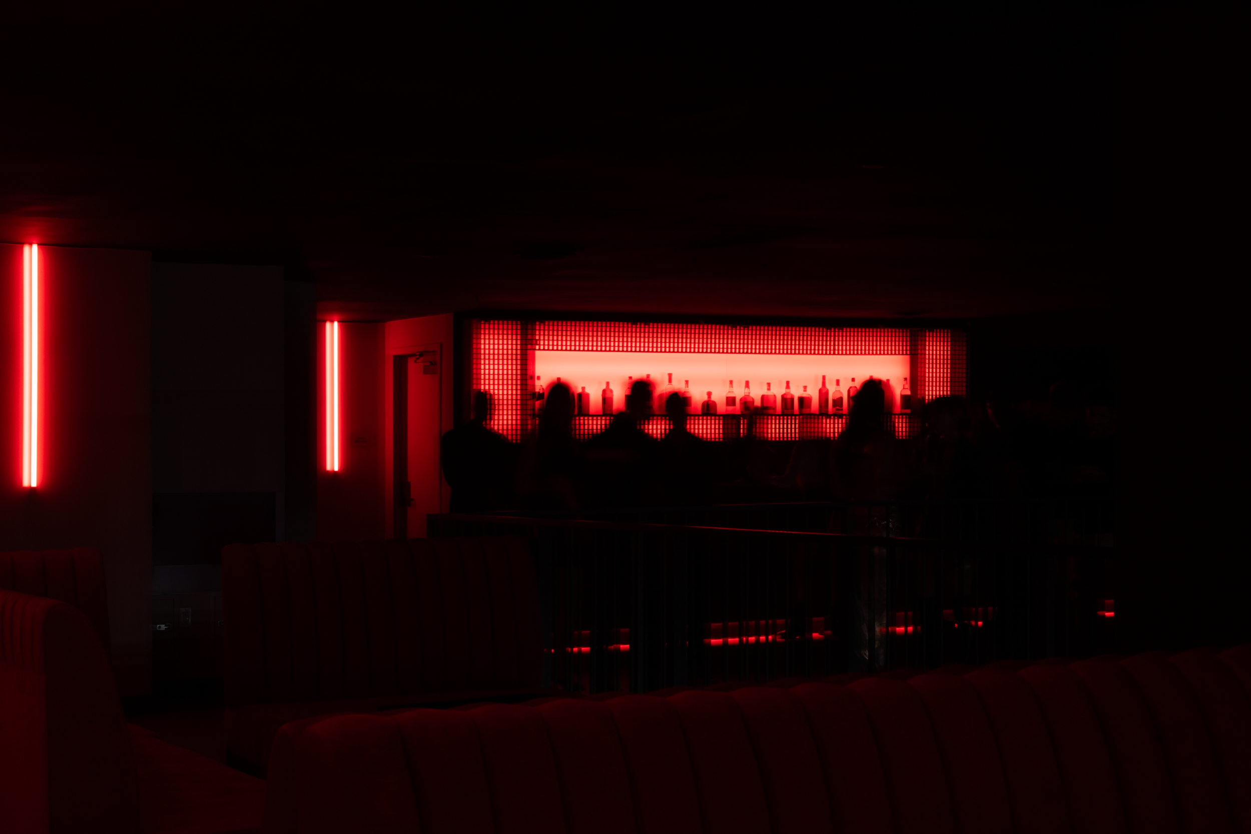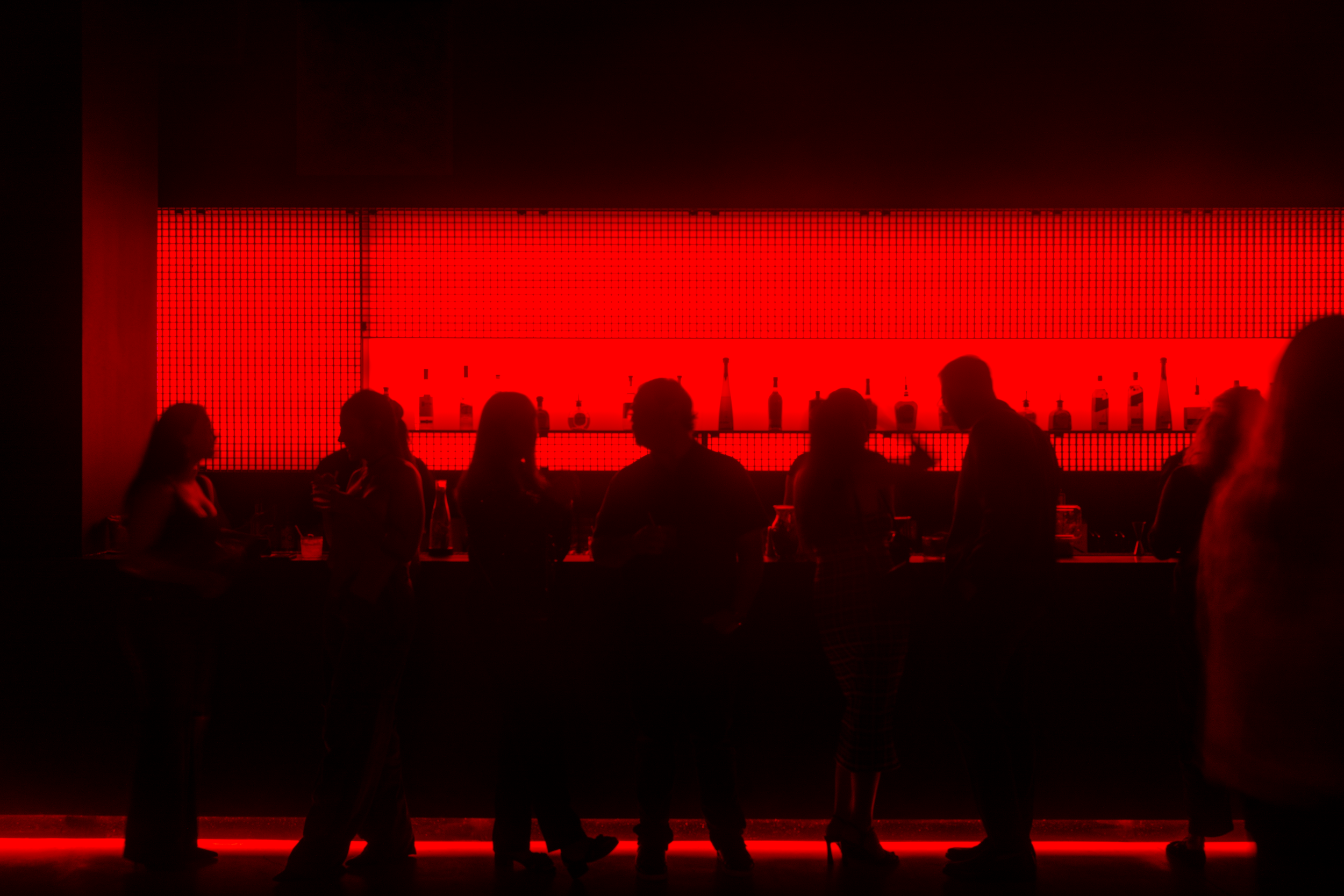 The linear LED lights are hung horizontally from the ceiling and vertically on the wall as a cohesive field to inform pacing and rhythm around the club. When layered with the FRP grid, the lights create glowing lines that animate when walking past. Behind the bar, a luminous sheet back-lights the bottles in a solid color field, mediated with a horizontal hole in FRP stretched across the bar shelf as an eye-level recess. Movement around the bar animates the light behind, as the angle of the FRP’s holes glow as visitors move past.